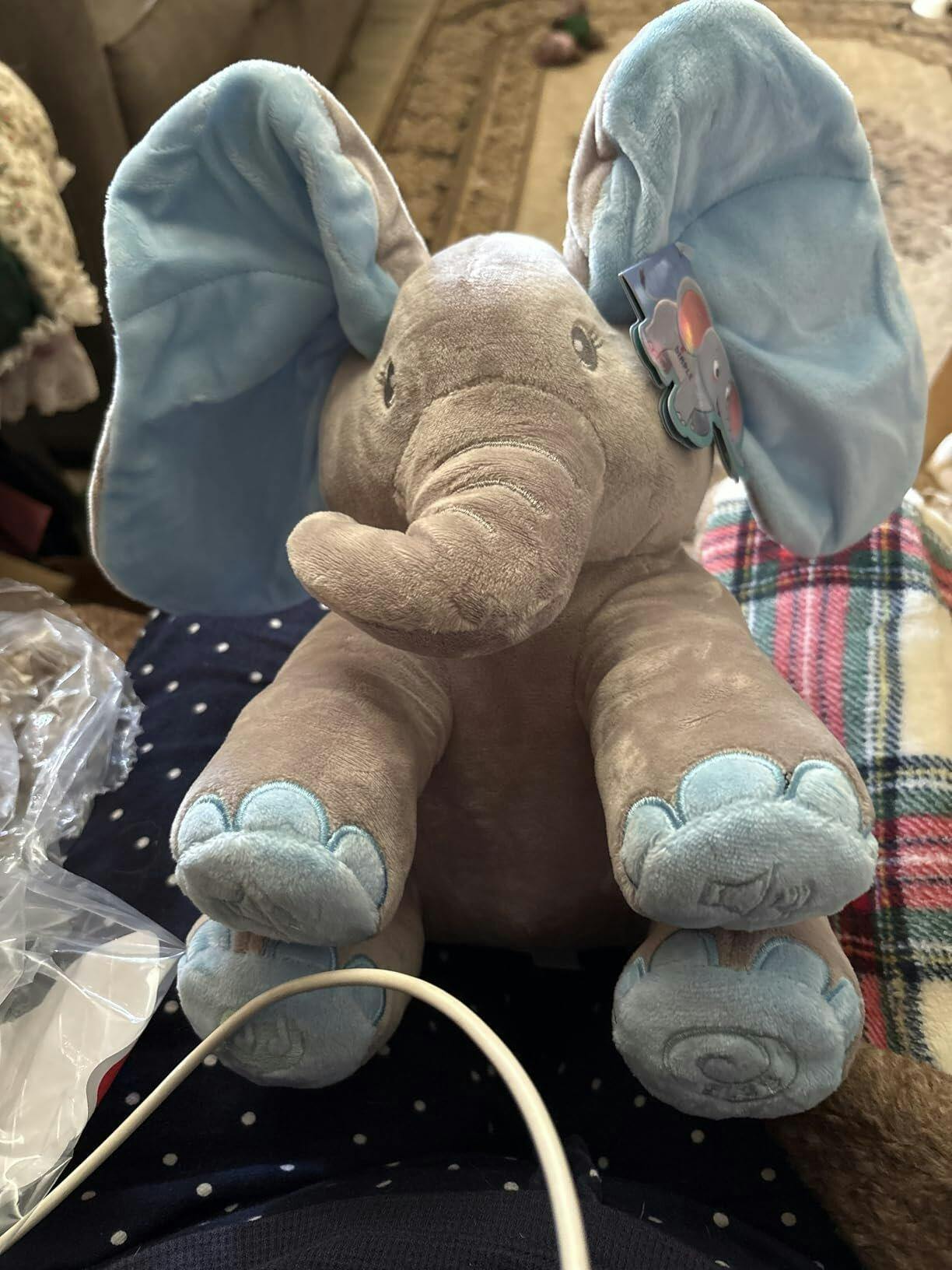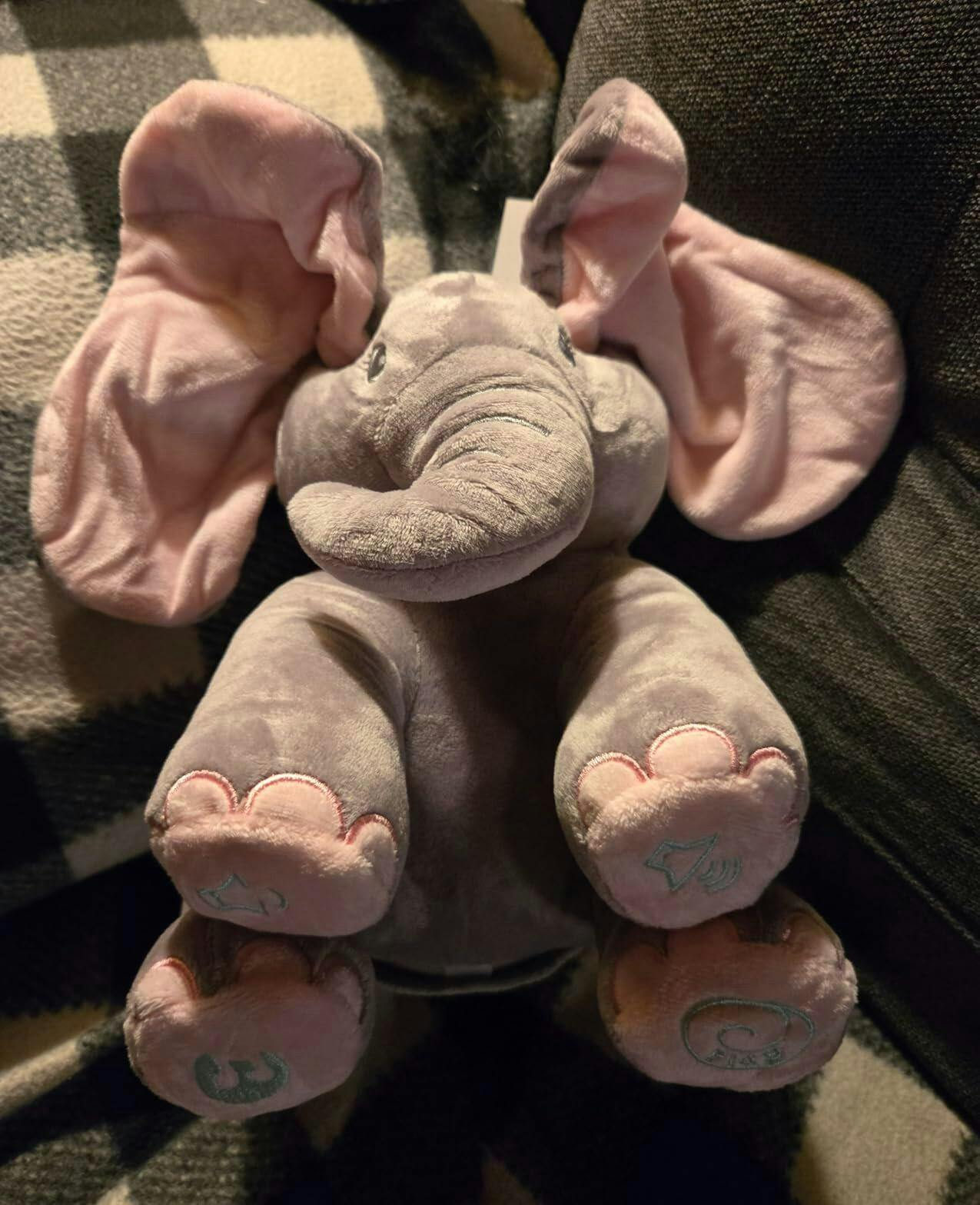 This was a Christmas gift for our 6 month old great granddaughter. She laughed so much when the elephant moved its ears in peek a boo. It is so soft and our great granddaughter loved it.